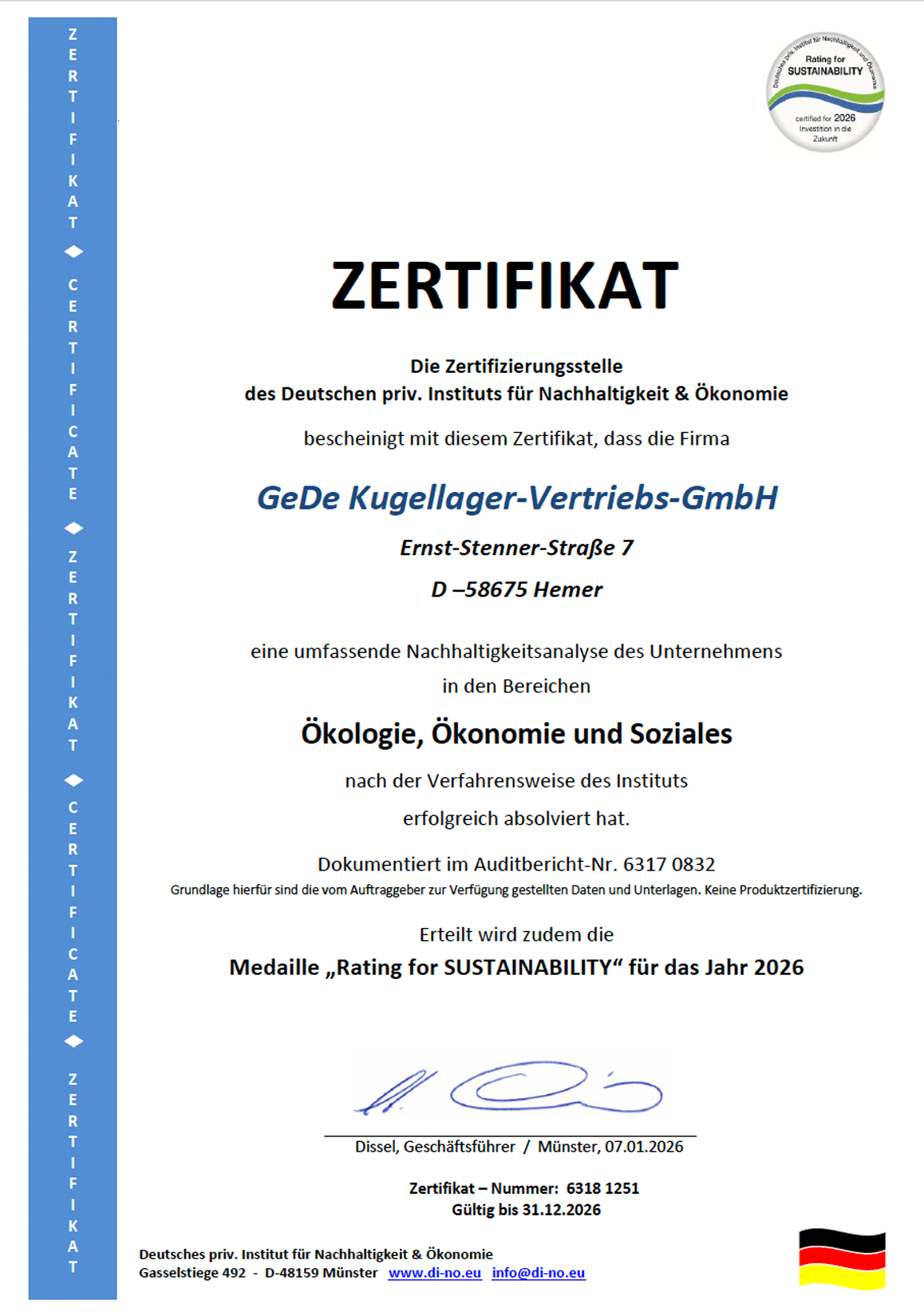 Zusätzlich haben wir eine umfassende Nachhaltigkeitsprüfung des Deutschen Instituts für Nachhaltigkeit & Ökonomie in den Bereichen Ökologie, Ökonomie und Sozialkompetenz erfolgreich bestanden. Dieses Prüfsiegel bestätigt unser Engagement für nachhaltiges und verantwortungsbewusstes Wirtschaften sowie für soziale Verantwortung.